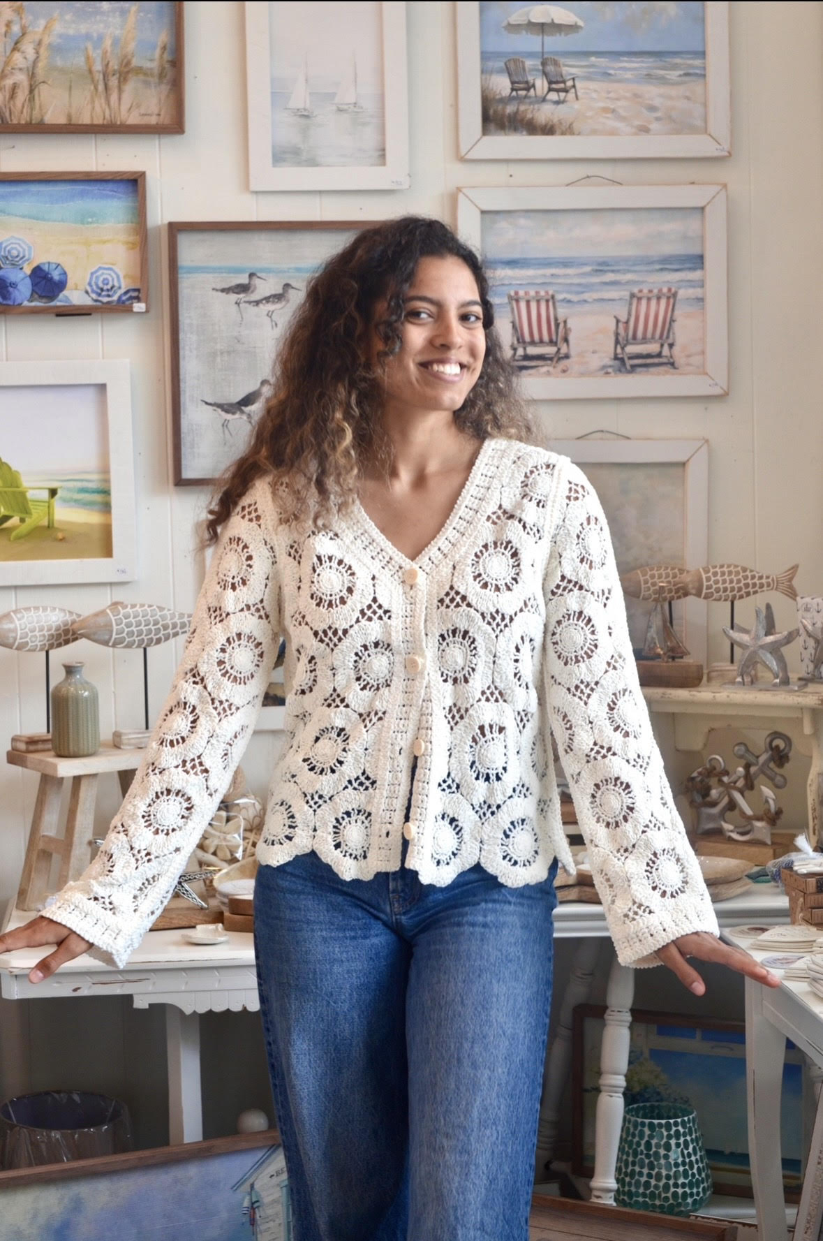 Soft ivory cotton crocheted sweater. The perfect piece to throw on with any outfit!